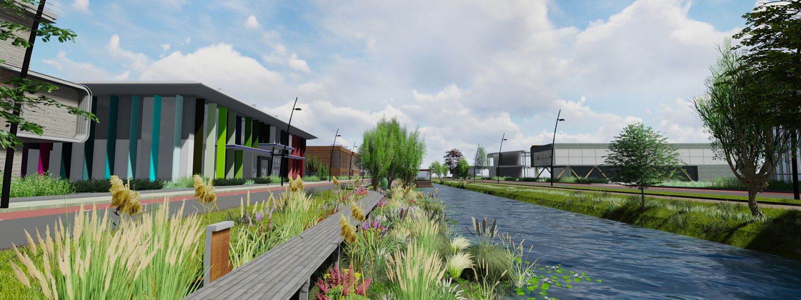 De ruggengraat van het bedrijvenpark is de 500 meter lange ecologische Middentocht met natuurvriendelijke oevers die het groenblauwe hart van het plan vormt. Hier wordt het verkeer afgewikkeld en worden de circulaire uitgangspunten ‘beleefbaar’. Groene daken, groene gevels en bovengrondse afvoer van overtollig hemelwater versterken het groenblauwe beeld. De inrichting van het gebied met veel water en groen is aantrekkelijk voor verschillende dieren en planten. Het is een inspirerende, gezonde en prettige omgeving op te werken en te ontspannen.