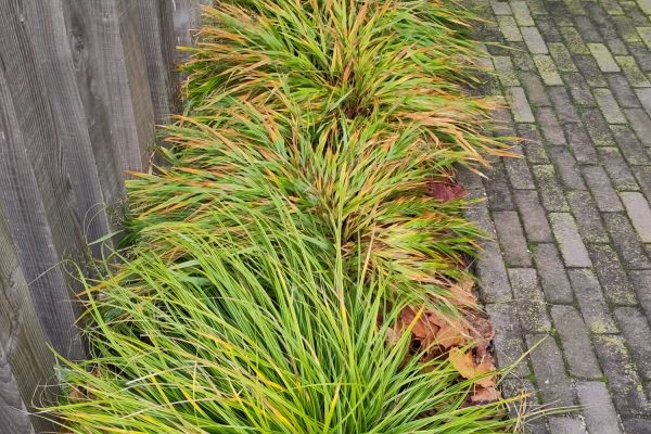 Minituin bij het kantoor in de vorm van bloembakken en verwijderen van bestrating.