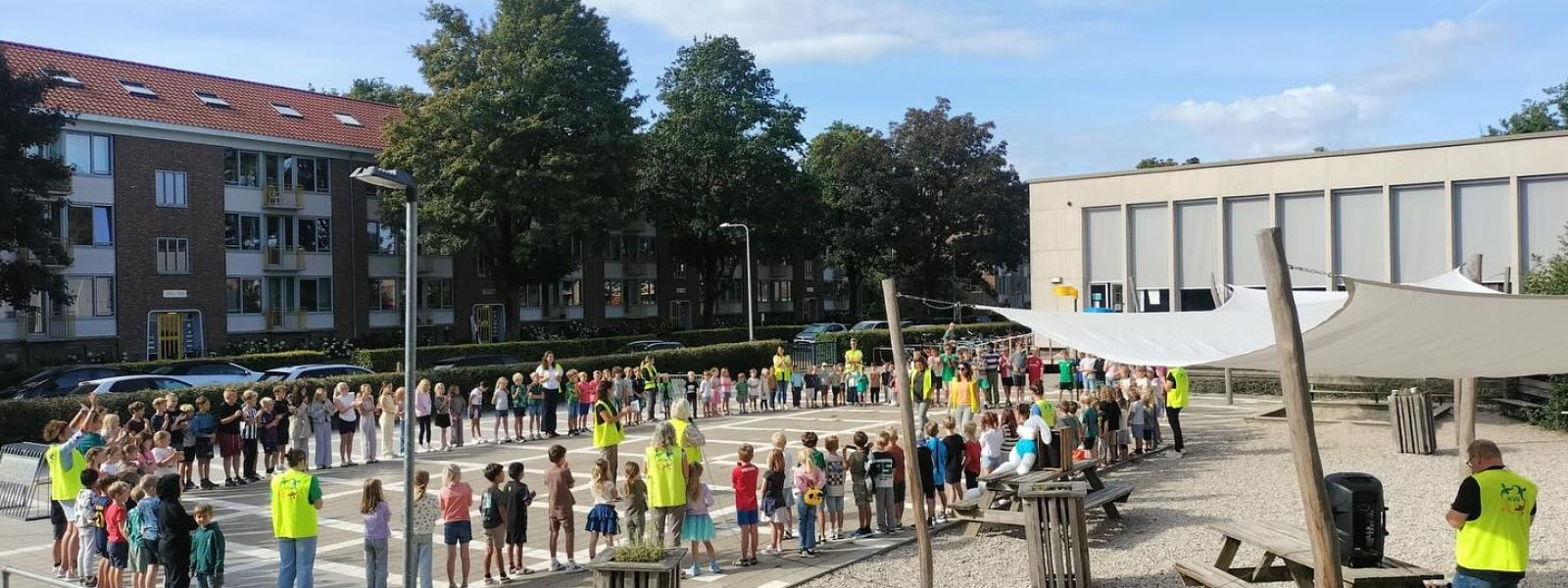 Bij de nieuwbouw is sterk ingezet op duurzaamheid en circulariteit. Het oude gebouw is zorgvuldig gesloopt, waarbij materialen zijn hergebruikt voor het nieuwe plein. Het schoolplein is klimaatadaptief ontworpen met een wadi en retentievelden om regenwater op te vangen en af te koppelen van het riool. Natuurlijke speelelementen, veel groen en hergebruikte bestratingsmaterialen maken het plein zowel duurzaam als educatief waardevol.