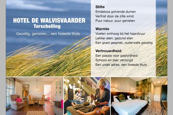 Hotel de Walvisvaarder … is een huiselijk hotel dat al 50 jaar een vertrouwd adres is voor vele gasten. Het is gelegen in Lies, aan de oostkant van het mooie Waddeneiland Terschelling, en ligt dichtbij wad, strand, bos en polder. Eind september 2019 is het hotel groots en duurzaam verbouwd. De oude boerderij (het voorste deel) werd gesloopt en ging letterlijk met de grond gelijk. “Het gebouw was zo oud en stond zelfs nog op enkel zand”, vertellen eigenaren Dick Visser en Ilma Trip. Half maart 2020 stond er een gloednieuwe Walvisvaarder, compleet aangepast aan de gemakken en technieken van nu. Maar, ook met herkenbare details van vroeger. Een van de belangrijkste redenen voor dit megaproject was duurzaamheid. Er viel op dat gebied zoveel winst te behalen, maar dat kon alleen in een compleet nieuw pand.