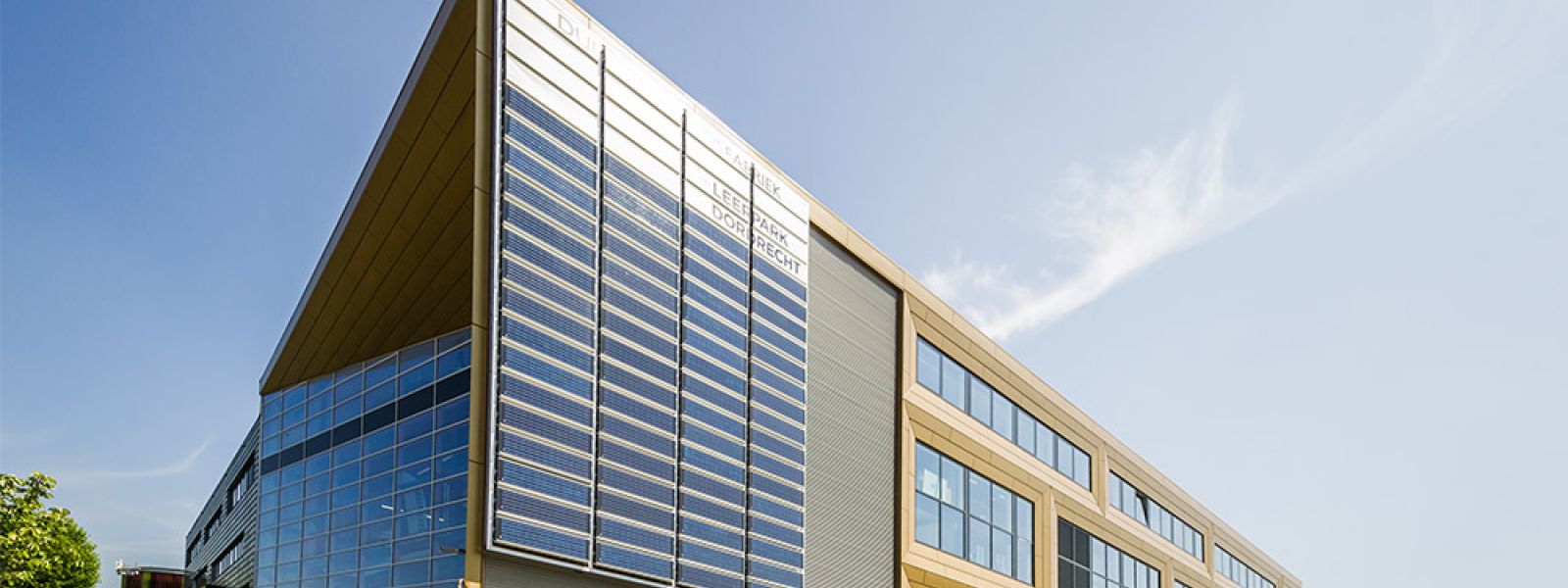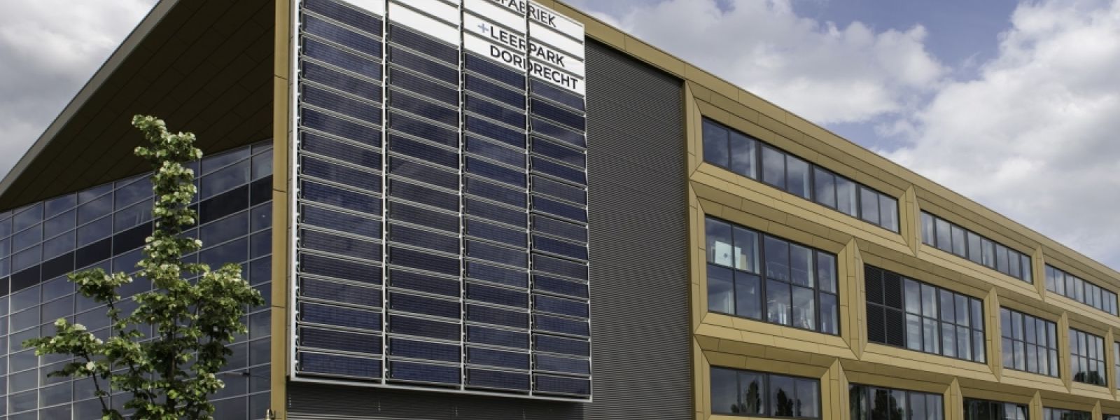 De Duurzaamheidsfabriek in Dordrecht is een circulair gebouw met energie-efficiënte installaties, CO2-gestuurde ventilatie en zonnepanelen. Het pand, gebouwd met herbruikbare materialen, functioneert als een leeromgeving voor studenten en bedrijven die werken aan duurzame innovaties.