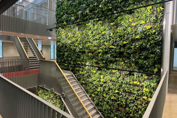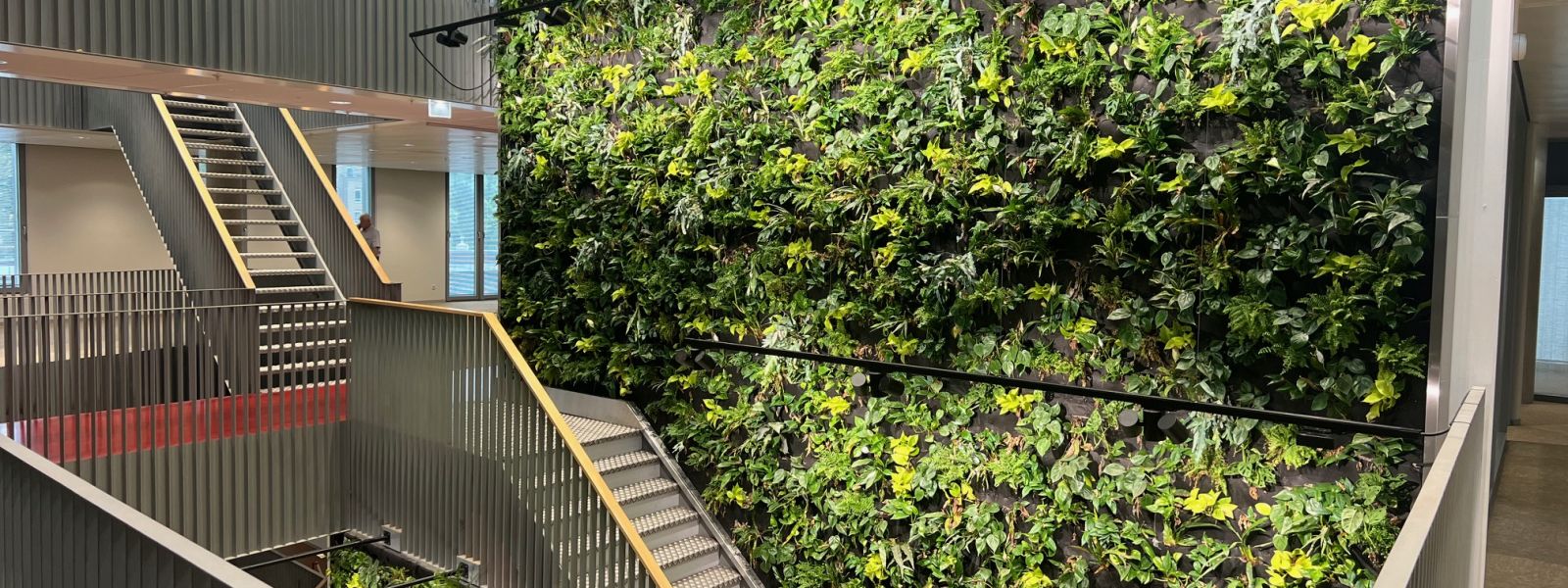 De grote levende groene wand van circa 10 x 12 meter zorgt voor een prettige werkomgeving en binnenklimaat. Het groen wordt continu voorzien van voldoende licht, water, bemesting en voeding.
