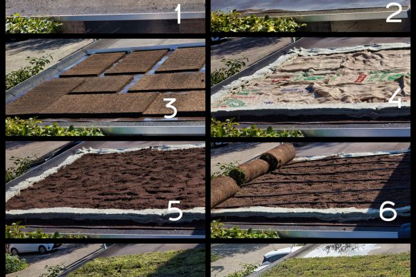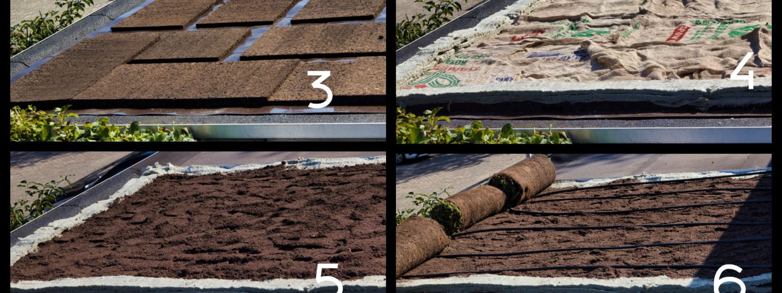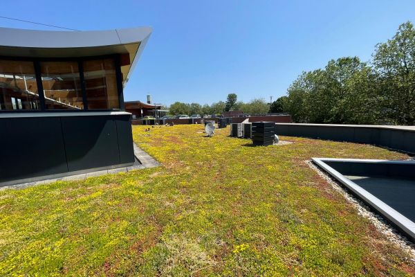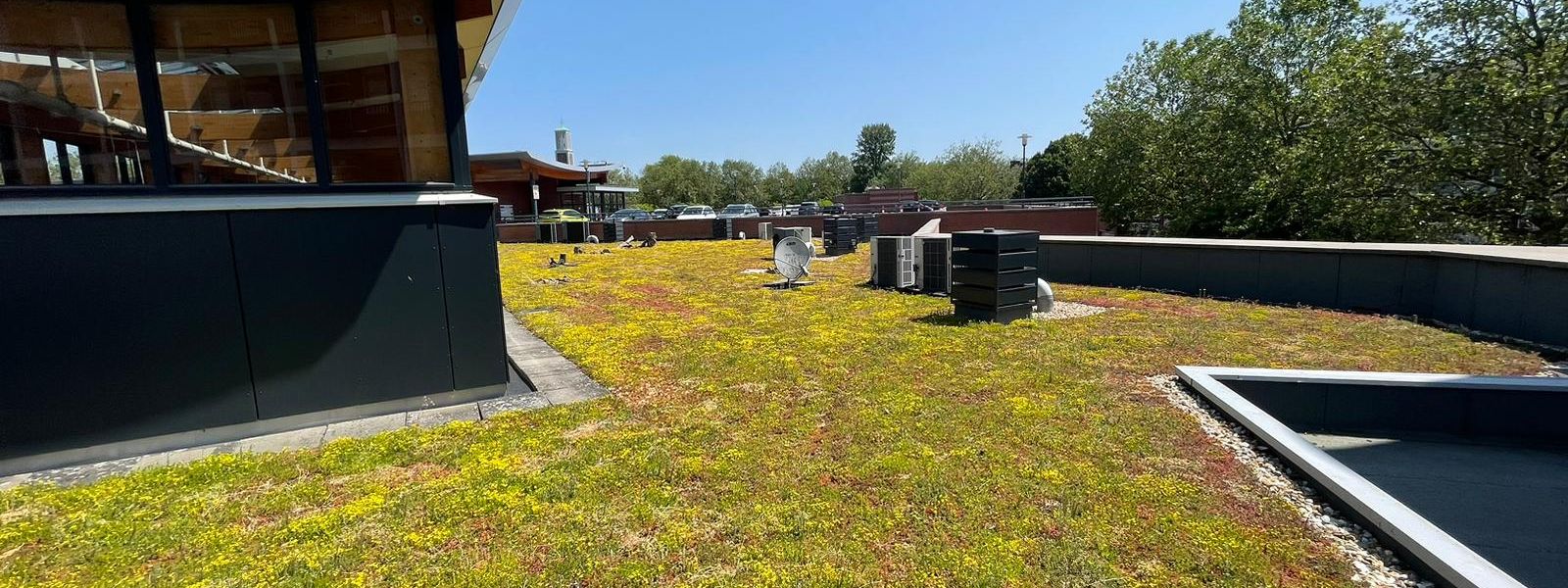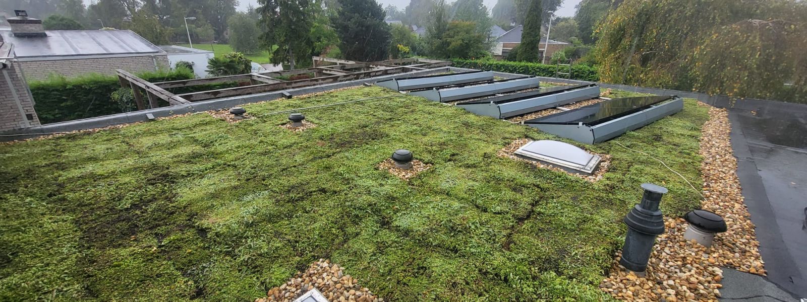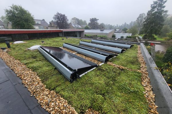 Groendak op ons kantoor met XPS isolatie en zonnepanelen.