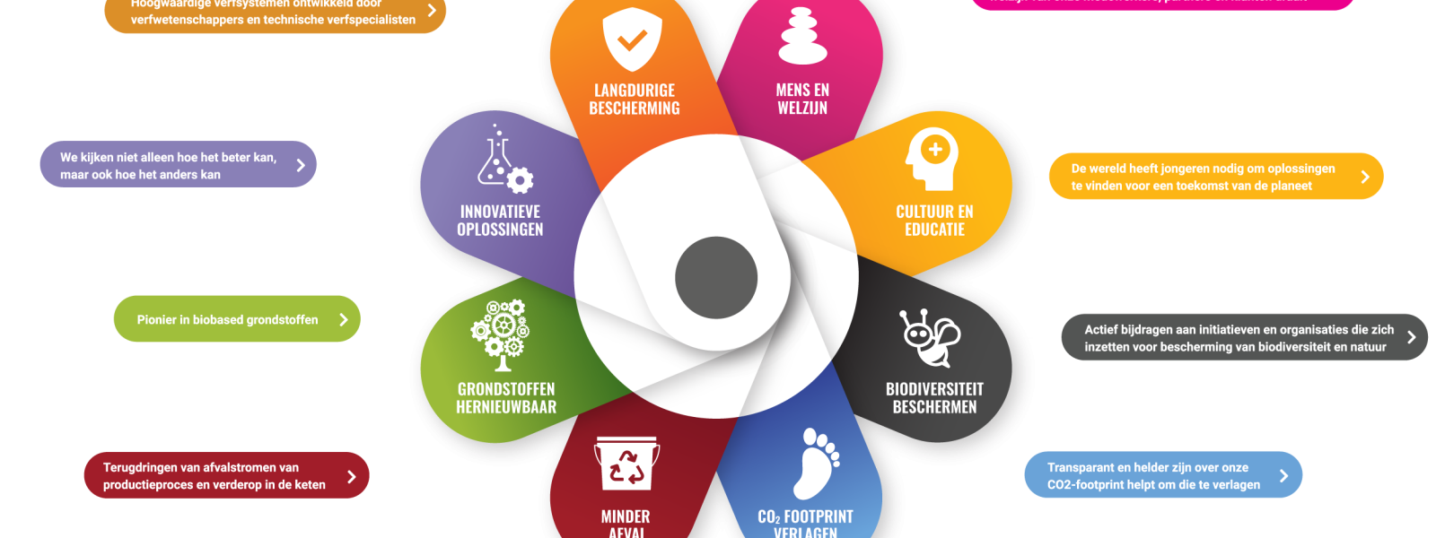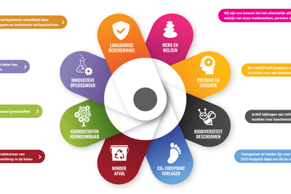 Royal Van Wijhe Verf B.V. … is koploper in duurzaamheid. Onze duurzaamheidsstrategie richt zich op 8 pijlers, het fundament van alle duurzame initiatieven (zie afbeelding). Dat komt voort uit onze familiewaarden. We hebben mooie meetbare resultaten geboekt, zoals het terugdringen van onze CO2 uitstoot. En ook voelbare effecten, want het draait bij ons naast mooie producten ook om mensen. Binnen en buiten onze organisatie.