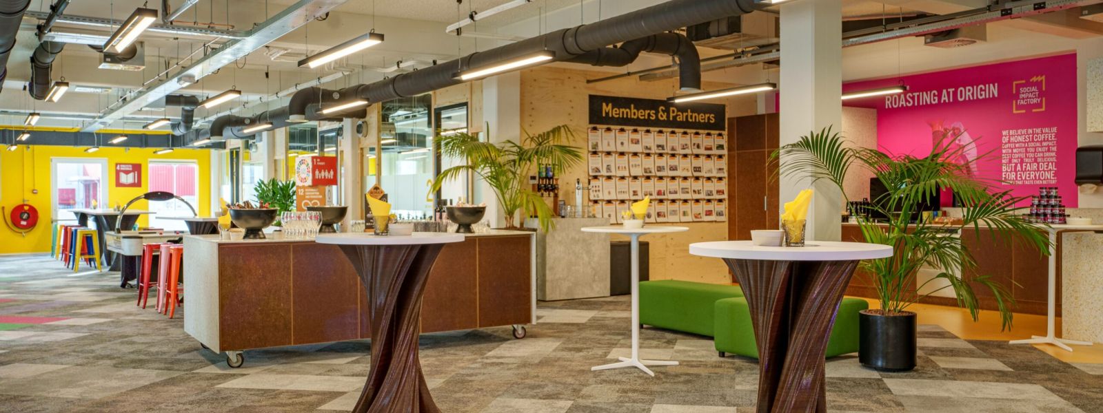 Onze Kauwgomballenfabriek is volledig ingericht met duurzame en sociale partners. Kom langs en laat je inspireren en verrassen door alles wat er nu al mogelijk is rondom duurzame en sociale keuzes voor inrichting en faciliteiten. Van de vloerkleden tot de keukenkastjes en van de bureaubladen tot de koffie en thee. De Social Impact Factory is dé plek waar alles samen komt. Voel je welkom voor een rondleiding, of om direct te komen ontmoeten, werken en vergaderen.