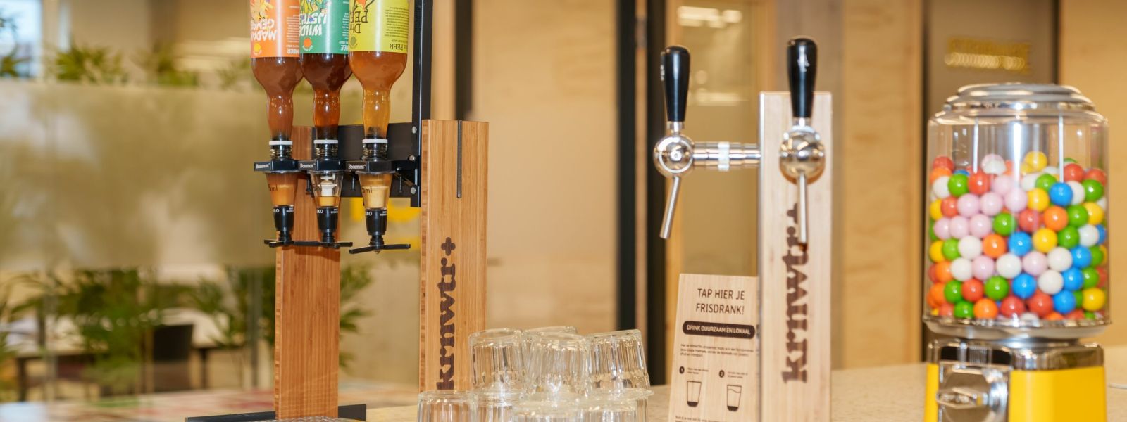 Op onze locatie zijn meerdere waterloze urinoirs geïnstalleerd, waardoor er veel water wordt bespaard. Ook bieden wij meerdere KRNWTR watertap punten aan waar plat en bruis water getapt kan worden, waardoor we geen plastic flessen water nodig hebben.