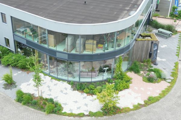 Het gebouw hebben we omgetoverd van autoshowroom en sportschool naar een circulair gebouwde broedplaats van ideeën en producten. We gebruikten de oude deuren en glas van het voormalig Decathlon gebouw, alle houtafwerking van Buurman Utrecht, roldeuren van Marktplaats en uiteraard onze eigen circulaire bestrating voor in de tuin en parkeerplaatsen.
