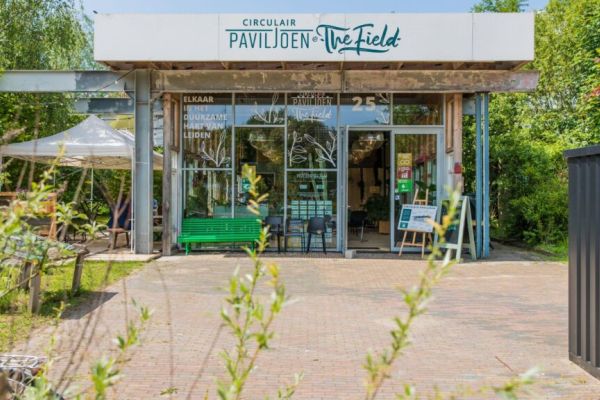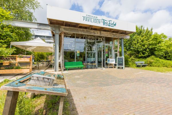 Het Circulair Paviljoen is gebouwd van hergebruikte materialen, zoals staalconstructie uit de sloop van een universiteitsgebouw, geupcyclede straatlantaarns uit het centrum van Leiden als verlichting, oude deuren en inbouwkasten van een bankgebouw als afwerkingsmateriaal in de toiletten, de douches van een tijdelijke sporthal zijn omgebouwd tot keuken.