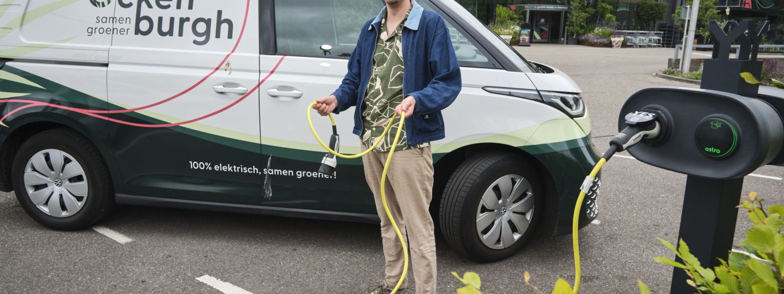 Elektrisch rijden is onderdeel van de bedrijfsvoering. Op het terrein wordt een 100% elektrische bedrijfswagen geladen.