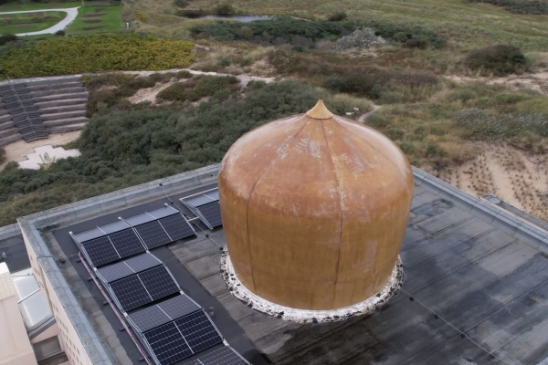 ‘We noemen ons complex tegenwoordig de Universel, omdat het een universeel gebouw voor verbinding is’, legt bestuurslid Joop Moerenburg uit. ‘De naam “Murad Hassil” betekent “wens vervuld” en verwijst naar de stichter van de soefibeweging, Hazrat Inayat Khan, die hier in de duinen een bijzondere mystieke ervaring had. De naam tempel vermijden we bewust, maar het is natuurlijk wél zo gebouwd. Het gebouw is helemaal vierkant, met evenveel nadruk op oost, west, zuid en noord. Dat is gedaan vanuit het idee dat mensen vanuit alle windstreken zich hier kunnen aansluiten.’ Eenmaal binnen is duidelijk hoe belangrijk de koepel ook voor het interieur is, gezien het licht dat hij in de centrale ruimte binnenlaat. Zo’n koepel is uniek in Nederland, maar vraagt ook wel wat extra zorg. Joop Moerenburg: ‘Hij heeft soms flink te lijden van de zeewind. Samen met het duinzand wordt ‘ie gezandstraald, dus om de zoveel tijd moet hij gepoetst en gelakt worden. De koepel is ook weleens weggewaaid, maar de laatste stormen heeft ‘ie gelukkig weer overleefd.’
