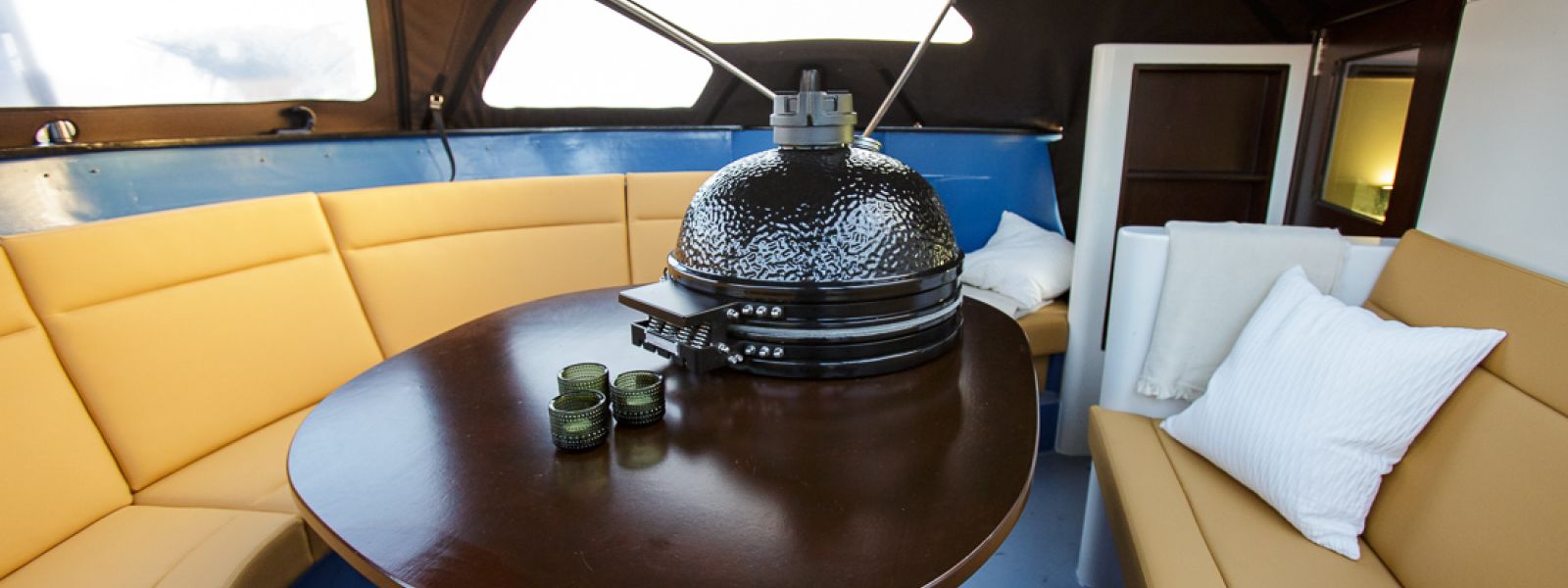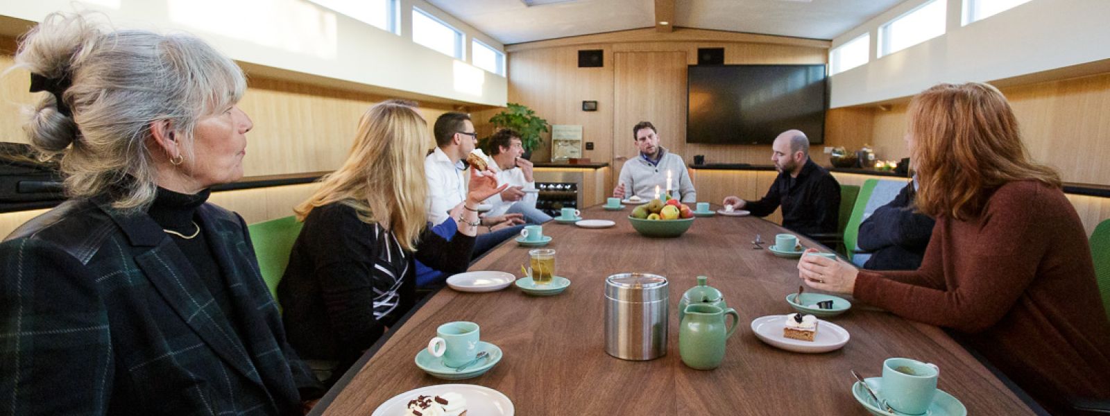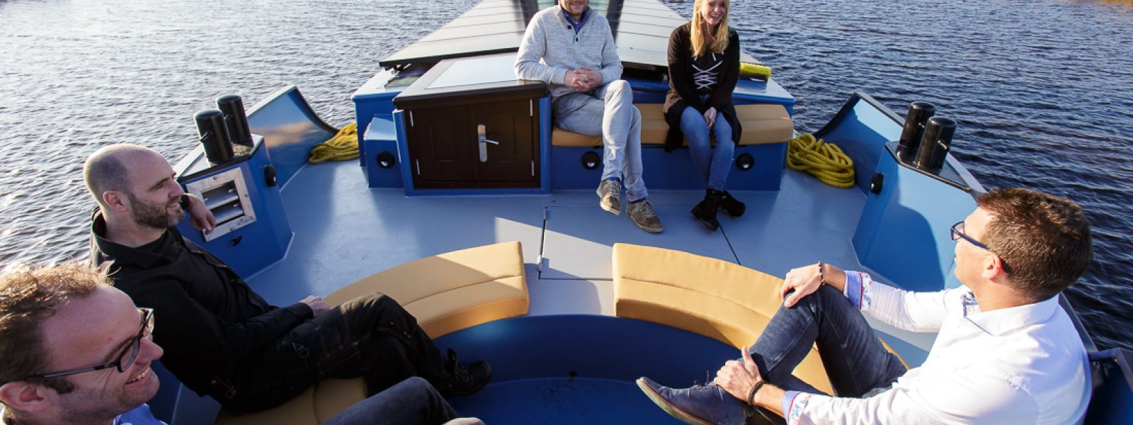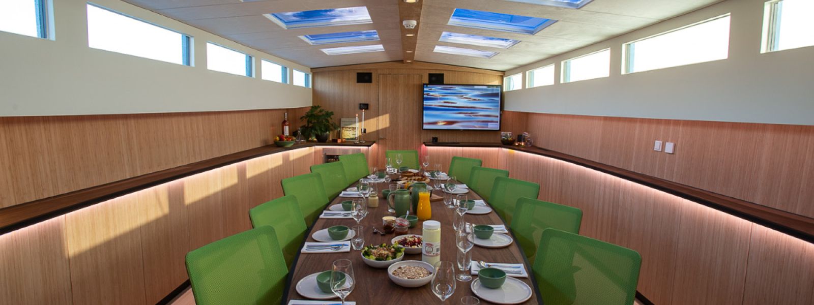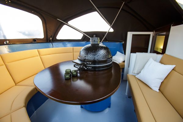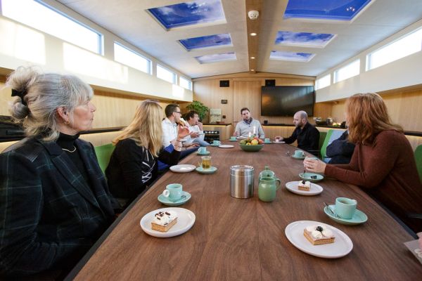 Aan boord heeft u binnen de beschikking over het vergaderruim, buiten zijn twee comfortabele ruimten waarvan één kan worden overdekt. Het ruim is voorzien van een interactief scherm, een eigen koffie automaat, goede wifi en comfortabele stoelen.