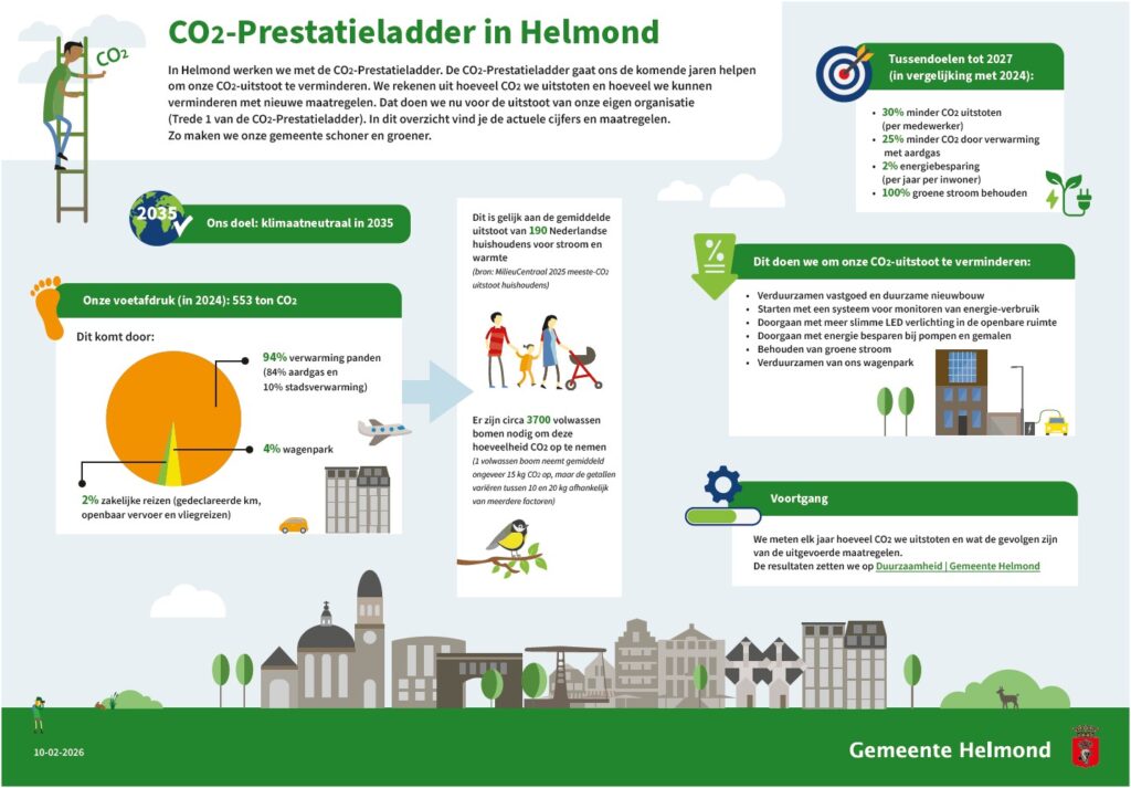 βDe CO2-Prestatieladder gaat ons de komende jaren helpen om onze CO2-uitstoot te verminderen. Op bijgaande factsheet zie je onze uitstoot in 2024. En ons plan met maatregelen om de uitstoot te verminderen. Zo maken we onze organisatie duurzamer en kunnen we als gemeente het goede voorbeeld geven aan onze inwoners en ondernemers.