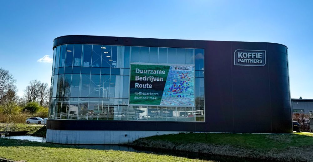 De Duurzame Bedrijven Route was te zien op een opvallende plek: het grote LED-scherm van KoffiePartners, pal langs de A16 in Zwijndrecht. En dat is niet zomaar een scherm β het draait volledig op zonne-energie, opgewekt door 270 zonnepanelen op het dak.
