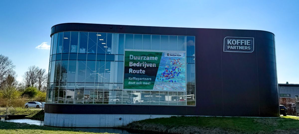 De Duurzame Bedrijven Route was te zien op een opvallende plek: het grote LED-scherm van KoffiePartners, pal langs de A16 in Zwijndrecht. En dat is niet zomaar een scherm โ het draait volledig op zonne-energie, opgewekt door 270 zonnepanelen op het dak.